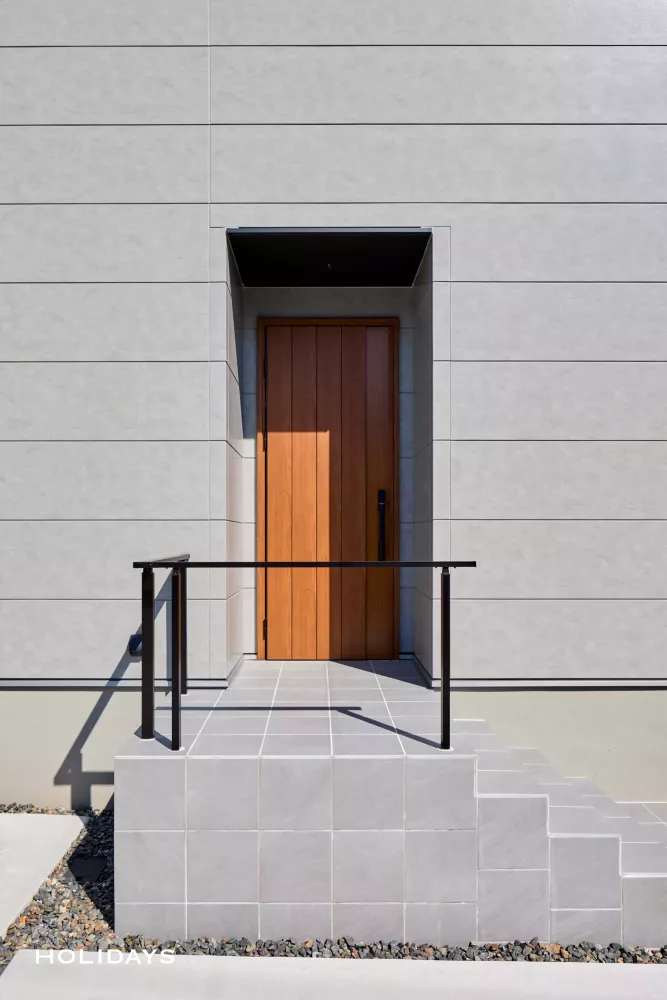 玄関ポーチには外壁と同系色のグレータイルを敷くことで、木調の玄関ドアを引き立たせている。