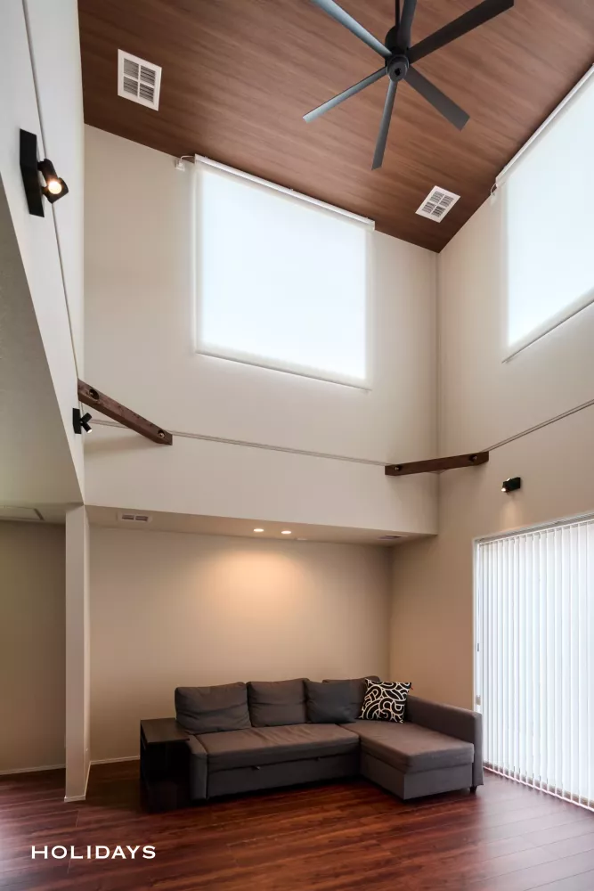 大きな吹き抜けで開放感たっぷりの広々としたリビングは、床・天井の木目カラーを統一し、まとまりのある綺麗な仕上がりになった。