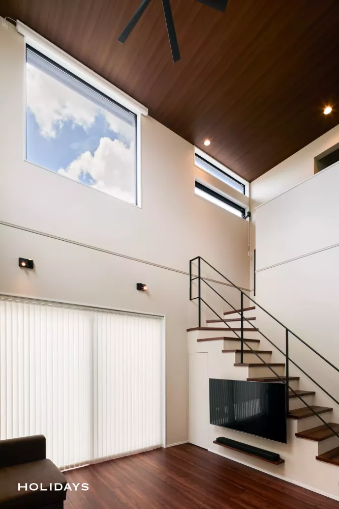 吹き抜けに設置した大きな窓からは、空を眺めることができ、更に開放感アップ。
