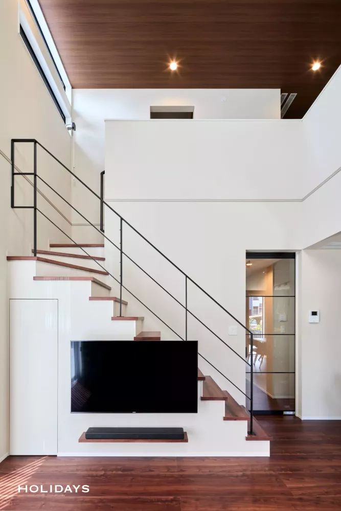 アイアンの繊細なデザインが美しいリビングドアと階段手摺が目を惹く空間。階段下のデッドスペースは上手く活用し収納スペースを確保。ハンドルレス・クロス仕上げの造作建具は、存在感を消し空間に溶け込む工夫をした。