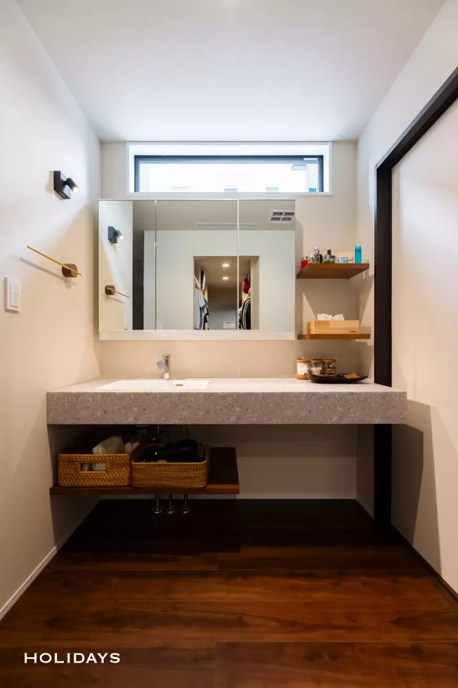 間口が約1.6mもある広々とした造作洗面カウンターを計画。三面鏡の中はもちろん、ミラー横さらには洗面下にも固定棚を設置し、ご家族分の洗面用品を十分に収納しておける。