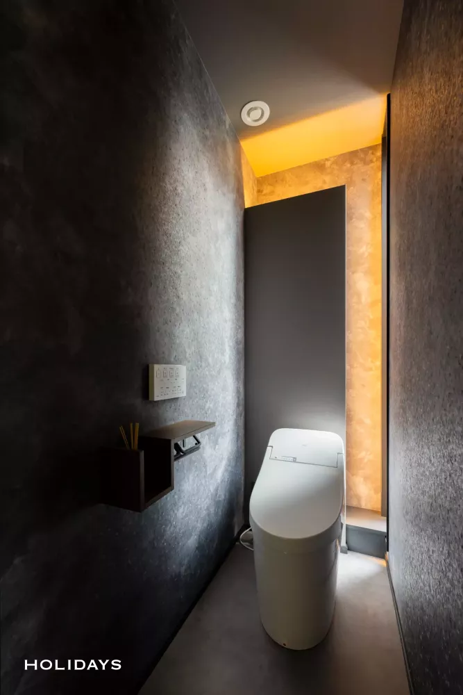 ダークカラーで統一し、背面に間接照明を仕込んだトイレは、まるでホテルのような大人かっこいい空間に。背面の壁奥には、見せない収納棚を4段造作したことで、ストックの保管に困ることなく、空間自体はスッキリ見せることができる。