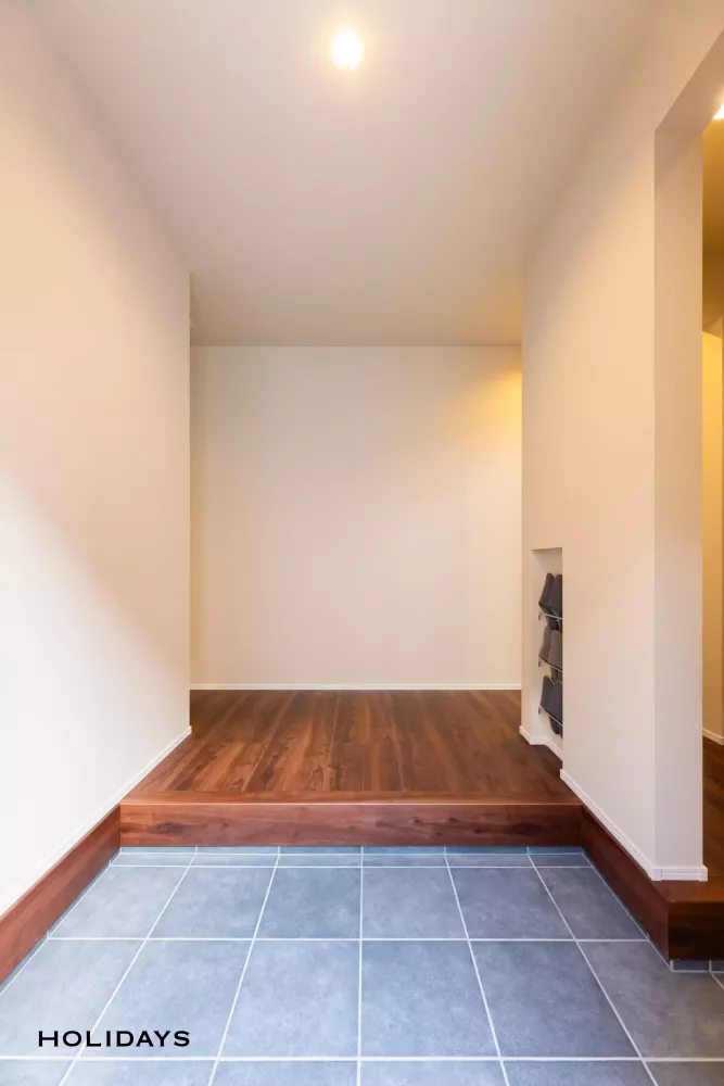 広々とした玄関土間。入って右側には、キャンプ用品や釣り道具など、お施主様の趣味用品をまとめて収納できるSICを計画。スリッパニッチも造作し、置き場に困りがちな来客用スリッパをスッキリを収納しておくことができる。