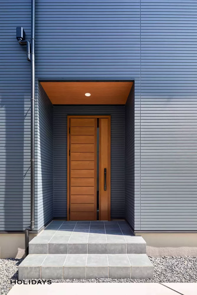 軒天と玄関ドアの色味を合わせることで、ネイビーのガルバリウム鋼板風のサイディグに映える空間となった。
