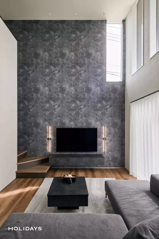 リビングに入ってすぐの8帖の広々吹き抜けを活かすように、窓、壁紙、照明を計画した。縦のラインを窓、照明で協調することで、より吹き抜けの高さを感じられる。家具の色味もグレー×黒に統一し、ずっといたくなる、そんな空間に仕上げた。