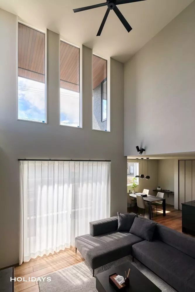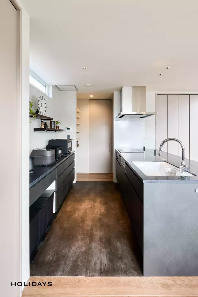 ダークグレーにまとめたシックな印象に、開放的な吹き抜けを合わせることでより高級感のある雰囲気に仕上げました。また窓を多く設計することで、太陽光をたっぷり取り込める明るい空間になっています。SICやパントリー、トイレ背面など収納も十分に確保しつつ、生活感を感じさせないよう設計しました。