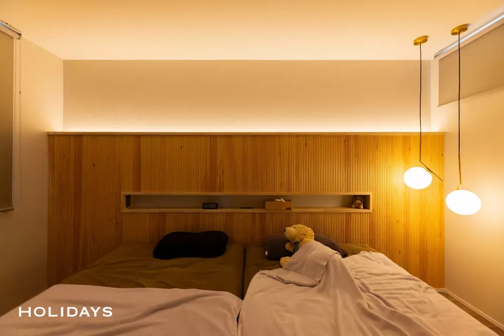 寝室は本物の木を使用したリブパネルと間接照明・デザイン照明をあしらい柔らかい印象に仕上げた。