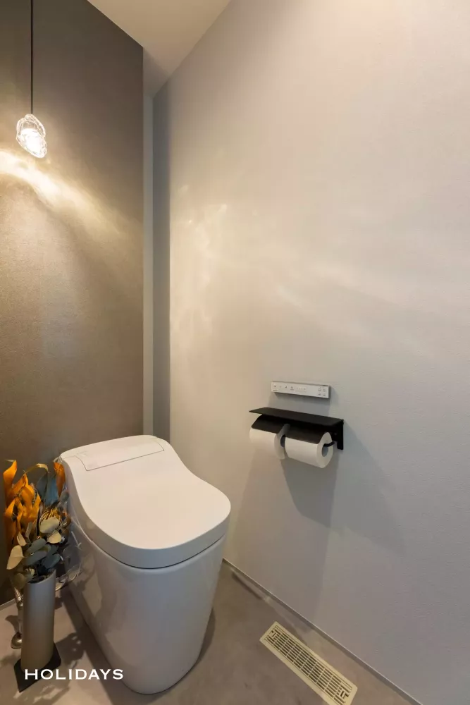トイレは背面に造作した隠し収納で生活感を感じさせない空間に。トイレの隣に幅1200mmの洗面化粧台を設け、トイレ内には手洗いを設けないことでスッキリとした印象を与えるとともに、掃除の手間を減らすこともできる。