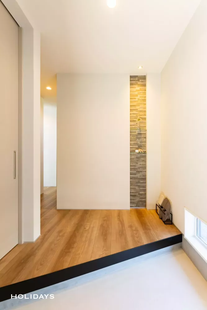 外観の斜め壁にリンクするように、斜めの框に仕上げた。玄関先にはニッチを造ることで、タイル+ガラス棚で思い出の品がお客様をお出迎え。左手のSICは扉をつけて隠しつつ、中にはたっぷりの収納棚を設けているため実用性もバッチリ。