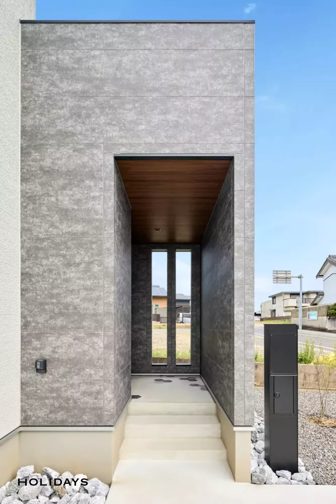モルタル調のライトグレーの外壁に、濃い石目調外壁が映える外観。斜め壁を取り入れ、凹凸に更に動きを追加することで、シンプルながら飽きの来ないお顔を造り上げている。