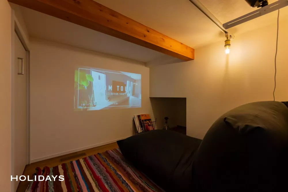 中二階の下を利用したシアタールーム。リビングとは建具なしで直接つながっているが、コンパクトに設計したことでおこもり感のあるスペースになった。