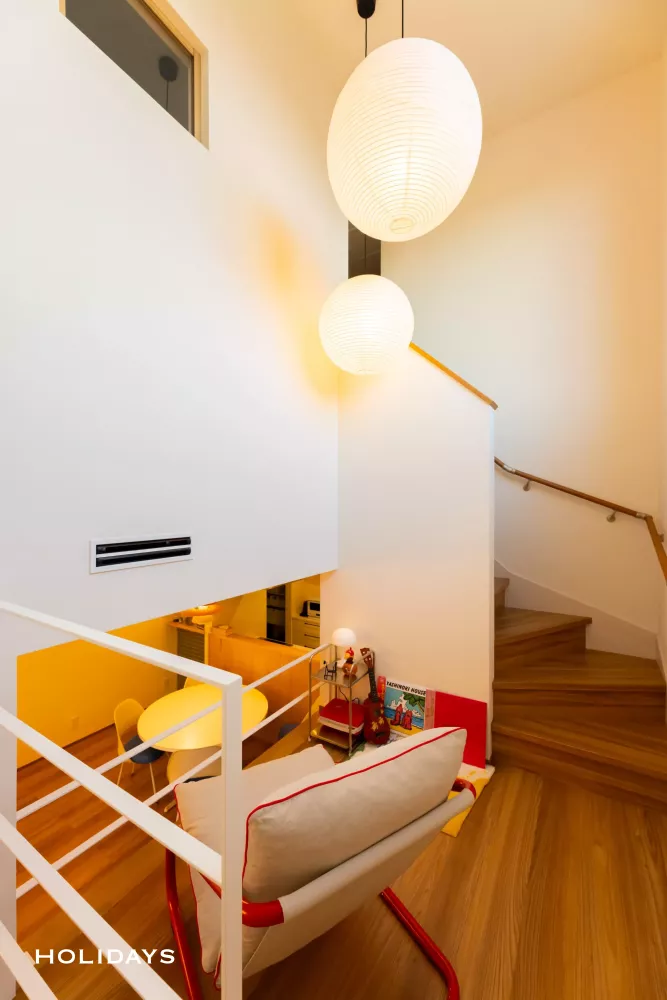 上部は吹き抜けとなっており、お家の中で一番開放感を感じる場所。リビングの中央に位置しているため、どこにいても家族の気配を感じながらくつろぐことができる。