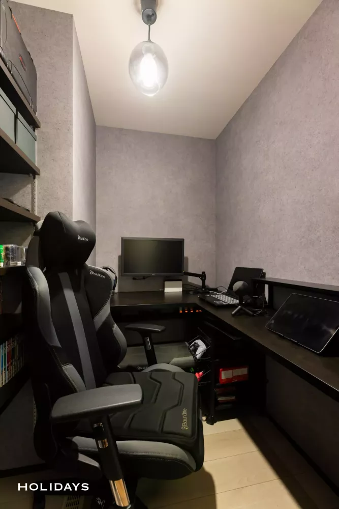 2階には1.5帖の趣味コーナーを設けた。カウンターは作り付けで、配線がスッキリするよう2段にしたりとこだわりのつまった空間となった。