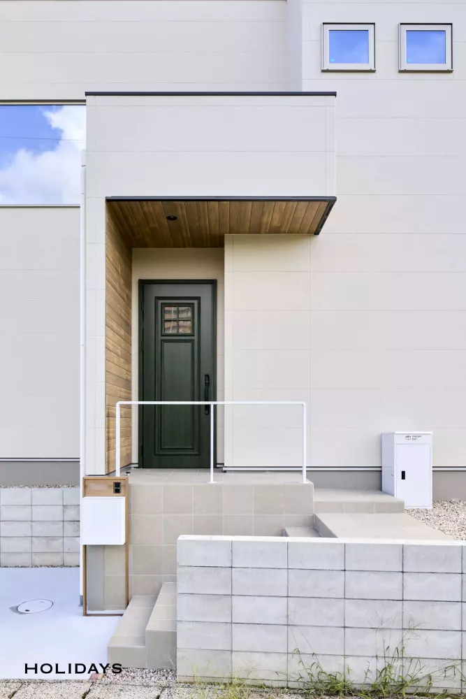 ベージュのやわらかい色合いの中に、ラフなデザインの木目とグリーンの玄関ドアが印象的な外観。