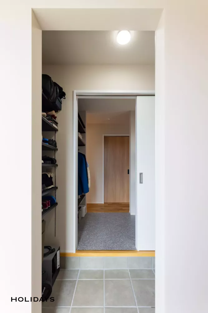 玄関のすぐ横にはSICがあり、可動棚で靴やベビーカーなど様々なサイズのものが収納できる。