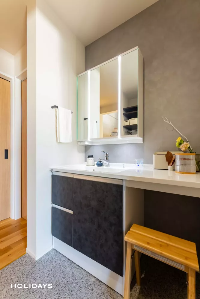 玄関ホールに設置した洗面台はカウンターも設け、朝の忙しい時間帯も並んで使用できるスタイルに。外から帰ってきてすぐに手が洗える動線のため、小さいお子様にも嬉しい間取りとなった。