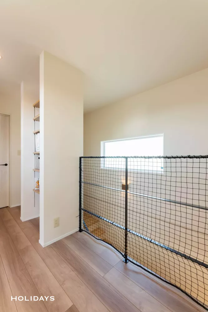 2階ホールは腰壁を無くしアイアン手摺を採用する事で開放感が生まれ、バルコニーからの光も階段まで届くようになった。