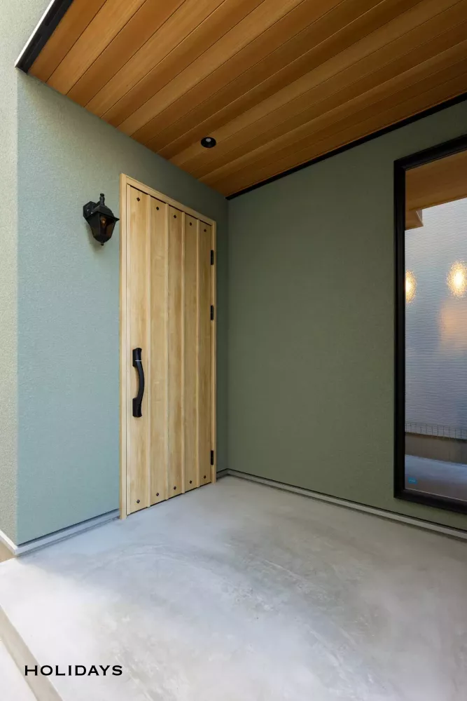空間デザインが映えるよう、玄関ポーチは長く、広々と計画している。上部には軒があるため、自転車も置いておくことができ、毎日の生活においてストレスなく過ごすことができる。