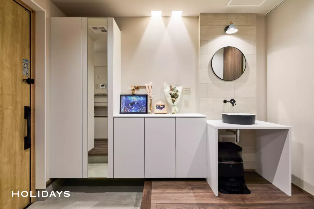 壁面に設けた下駄箱スペースと一体型にデザインした洗面が、空間の主役になっている。また圧迫感を軽減するためホワイトを基調とし、そこに照明の陰影がうつることで空間に立体感を出している。