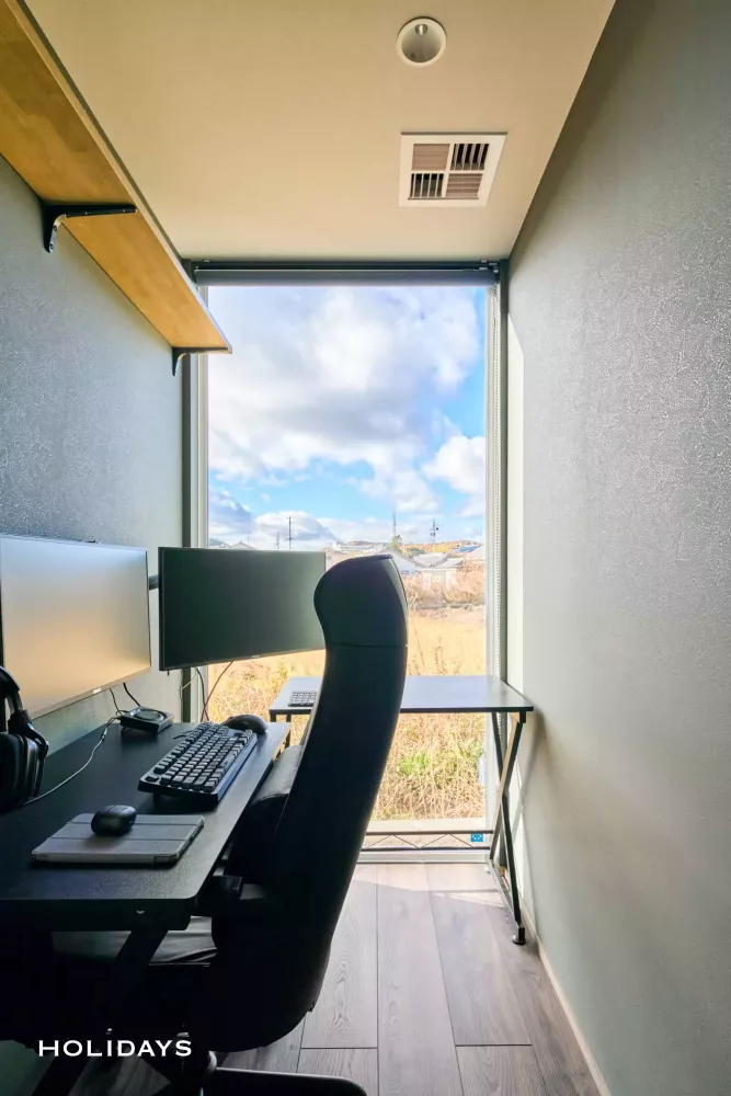 書斎スペースには、床から天井までの特注サッシを計画。日中は景観を楽しみながら、一人の時間を優雅に過ごすことのできるとっておきの書斎となった。ロールスクリーンを設けているため、光の調整や視線を遮ることも簡単に行える。