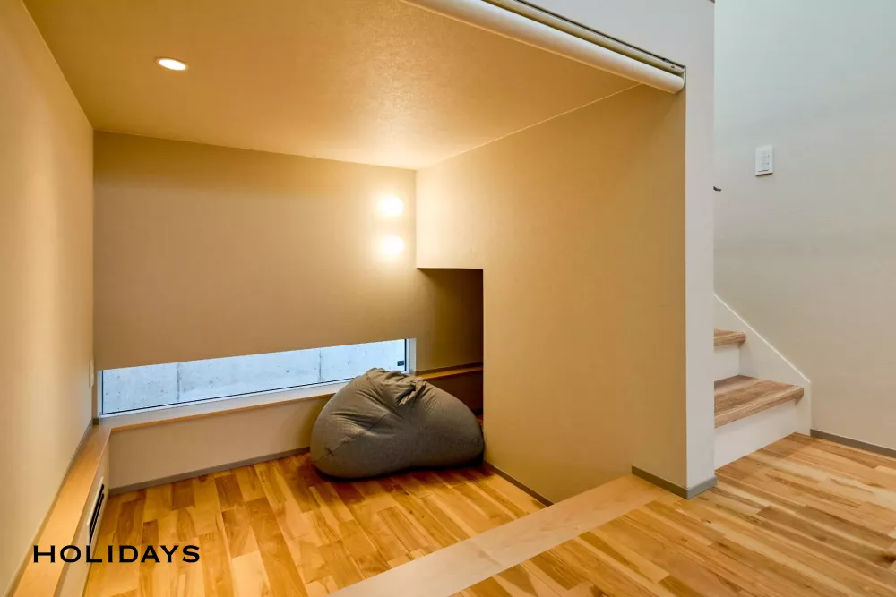ダウンフロアになってるヌックはお子様のちょっとした基地に。ロールスクリーンをおろせば籠り感がアップし、秘密基地のようなワクワク感をもたらしてくれる。また、まるいブラケットライトを2灯ならべることで、シンプルでありながらも可愛らしさのあるアクセントに。