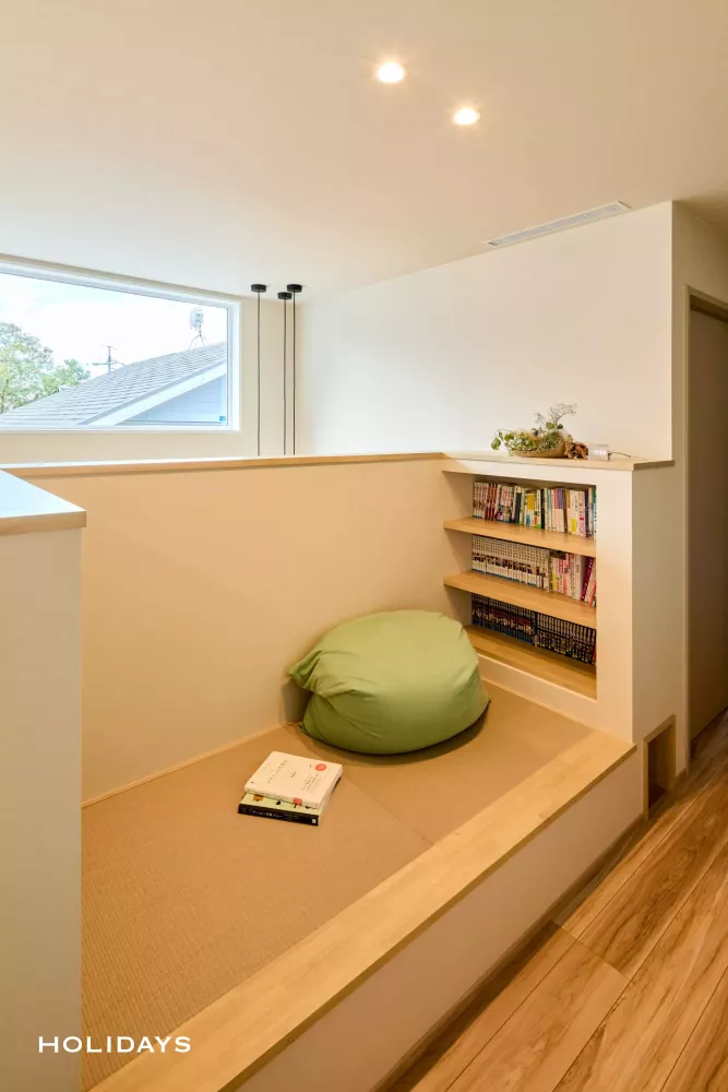 2階にあがった先には小上がりの畳スペースを設計。雑誌や漫画をもちこみくつろげるスペースとなった。
