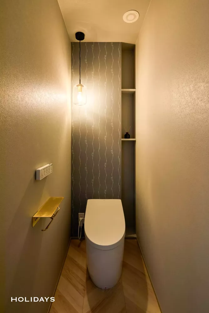 トイレ背面の収納スペースは、すっきりとした見た目でありながらもしっかりと収納力を確保している。