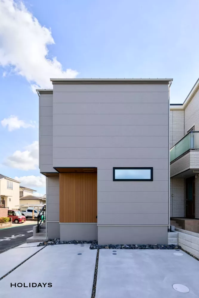 グレージュを基調とした外観に、凹凸部分や軒天の木目がアクセントとなり、目を引く仕上がりとなった。
