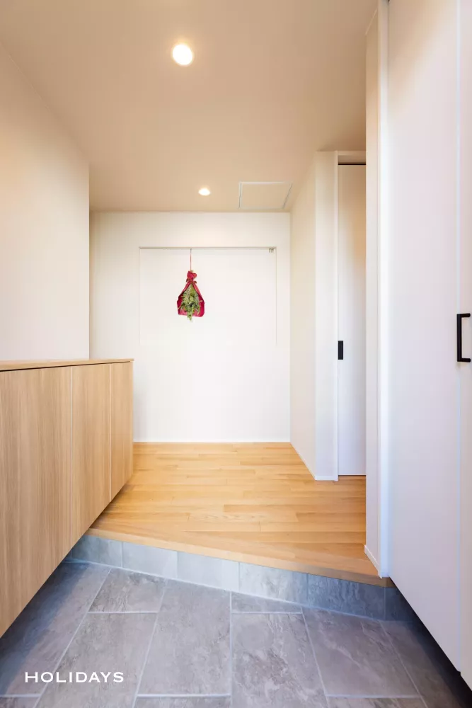 玄関ホールの正面にニッチを作成し、その上部にピクチャーレールを取り付けることで、スワッグやフォトブースのような使い方はもちろん、季節の飾り物を楽しむ空間としても活用できる。ロータイプの下駄箱は圧迫感を抑えながら十分な収納を確保でき、さらにディスプレイカウンターとしても使用可能。