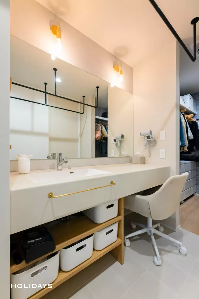 幅160cmほどの広々とした造作洗面化粧台には、オープンスペースを設けることで、腰を掛けながらゆったりと身支度できるスペースとなった。また一面鏡を端から端まで設置することで、2人で並んでも余裕のある快適な空間に。真鍮の照明やタオルバーが、さりげないアクセントを添えている。