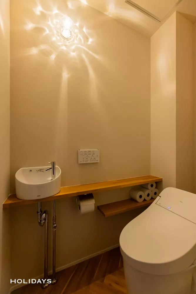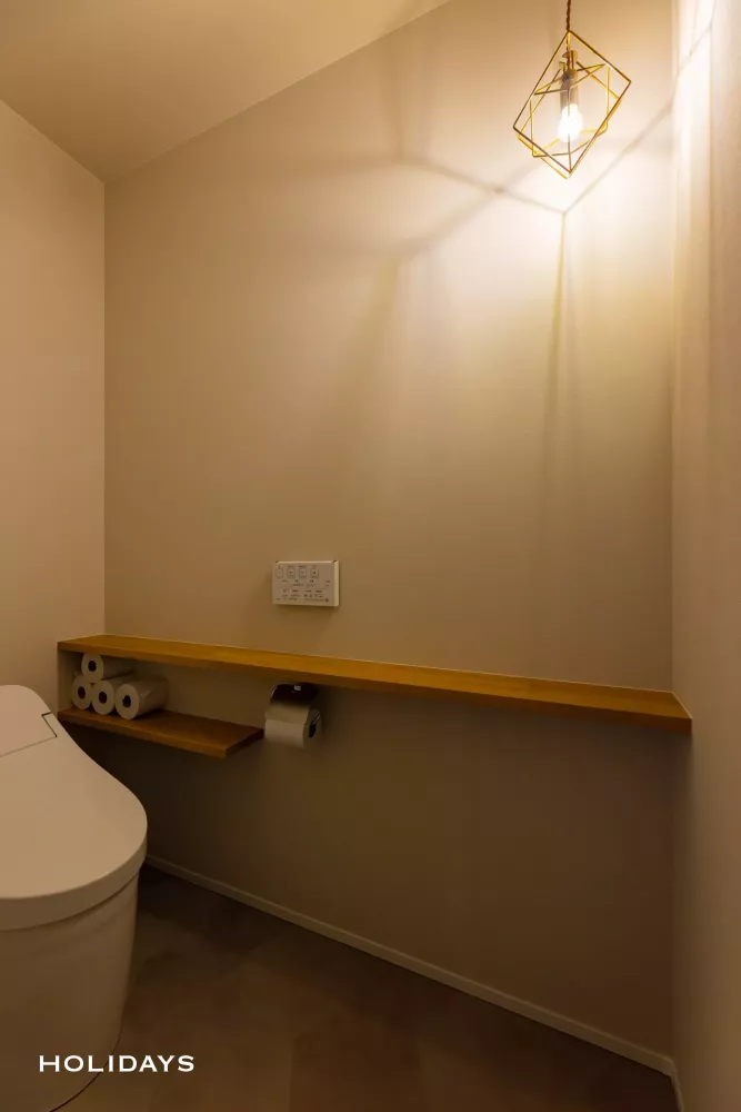 1階と2階のトイレには、それぞれサイドに棚板収納を設け、見せる収納とした。トイレットペーパーをリズミカルに収納できるだけでなく、ディフューザーや小物を飾ることも可能。照明の陰影が、より一層素敵な空間を演出してくれる。