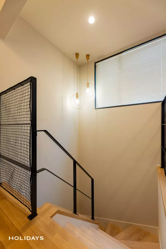 ペンダント照明は階段の隅に設置することで、日々の動線を妨げることなく明るさを確保できる。また壁面に映し出される陰影が幻想的な雰囲気を醸し出している。