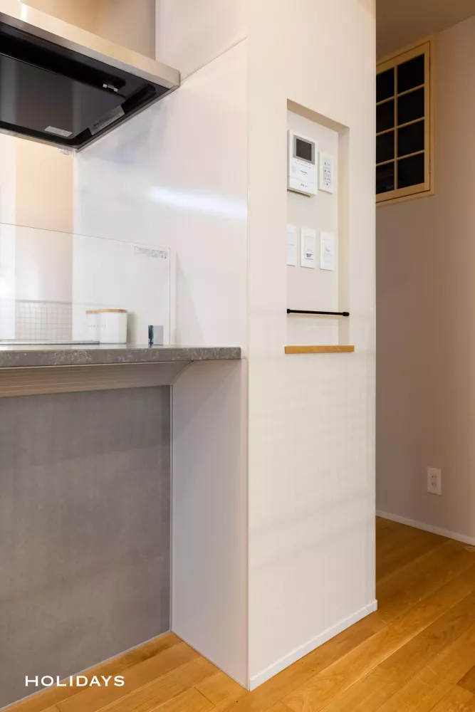 家族皆がアクセスしやすいキッチン横には、スイッチや給湯器リモコンをまとめたインフォメーションニッチを設けた。