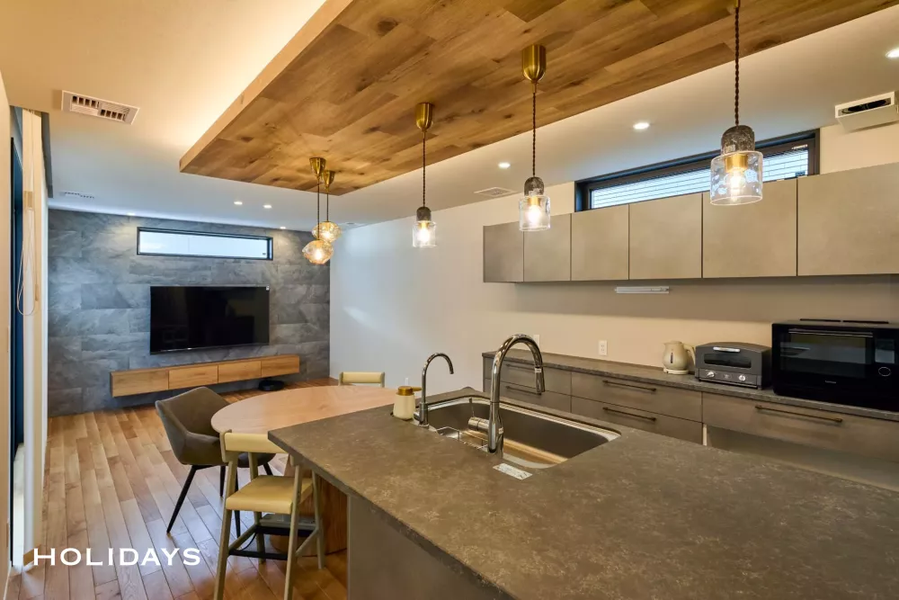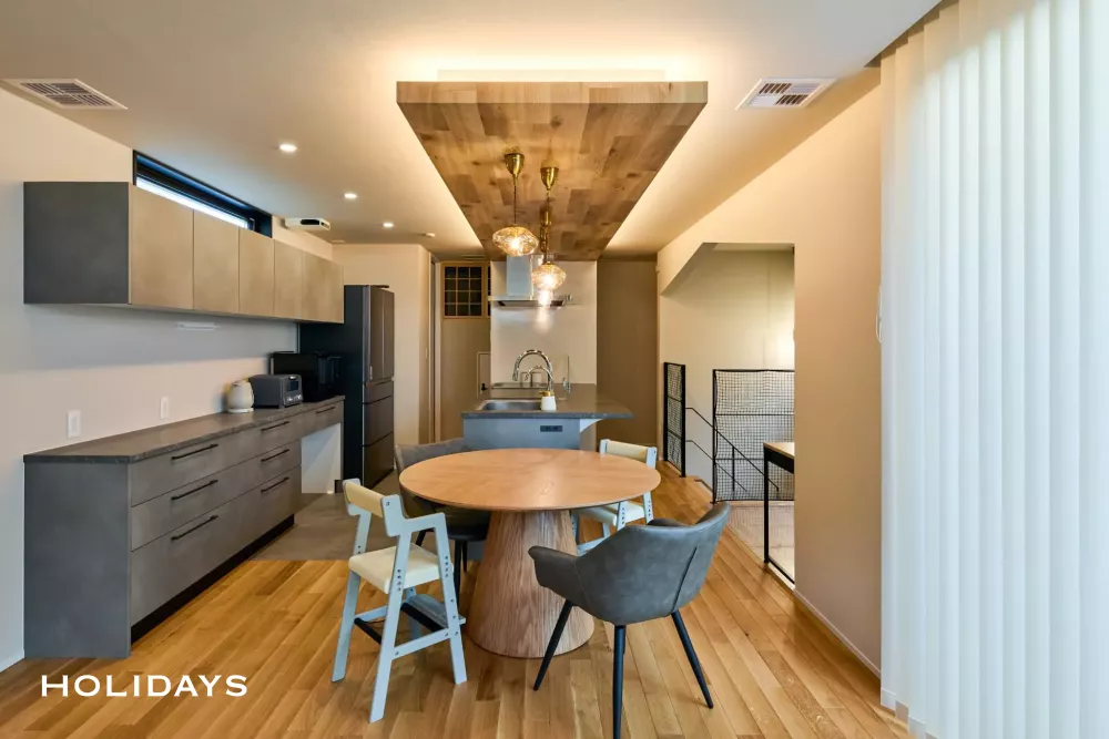 キッチンの下がり天井は、空間に特別な印象を与えるとともに、LDK全体の奥行きを強調している。また、コーブ照明を設けることで上質な雰囲気を加え、目を引くLDK空間となった。
