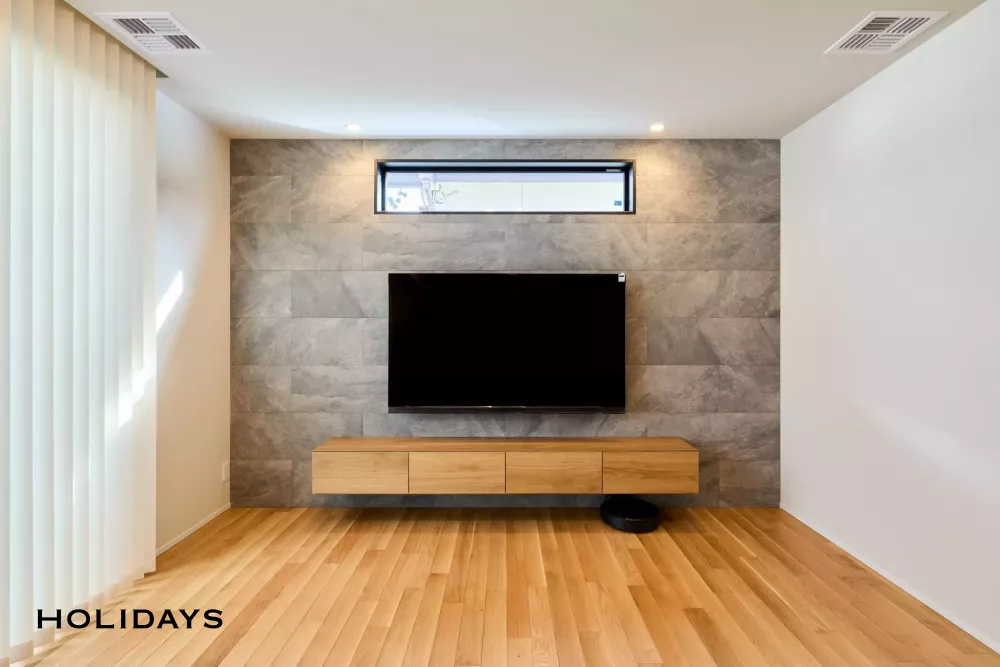 テレビの背面には、デザイン性と共に調湿・脱臭効果を兼ね備えたエコカラットを採用。キッチンと同じトーンのグレー色を選定することで、統一感を図りつつ空間のアクセントに。窓とテレビボードのラインを揃えることで、より洗練された空間を演出している。