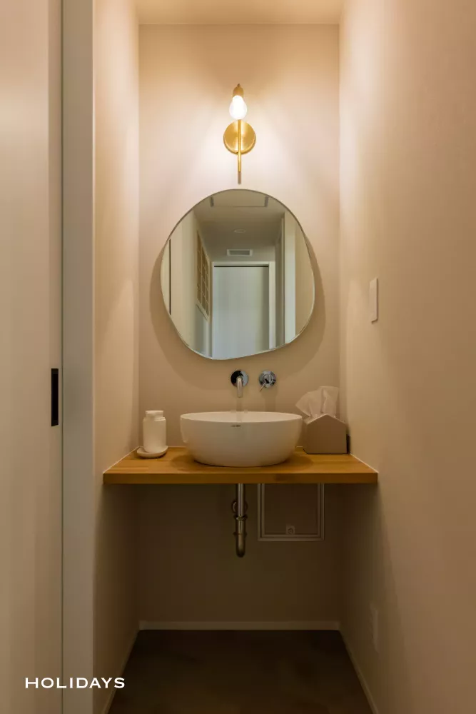 2階の手洗い場は、デザイン性を重視した計画に。湾曲ミラーをアクセントとして取り入れ、実用的な機能を備えながらも、空間のインテリアとしての美しさも追求している。