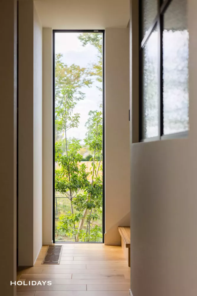 玄関ホールの先には植栽が映えるFIX窓を設計。そこから差し込む光と緑が、空間に彩りを与えてくれる。