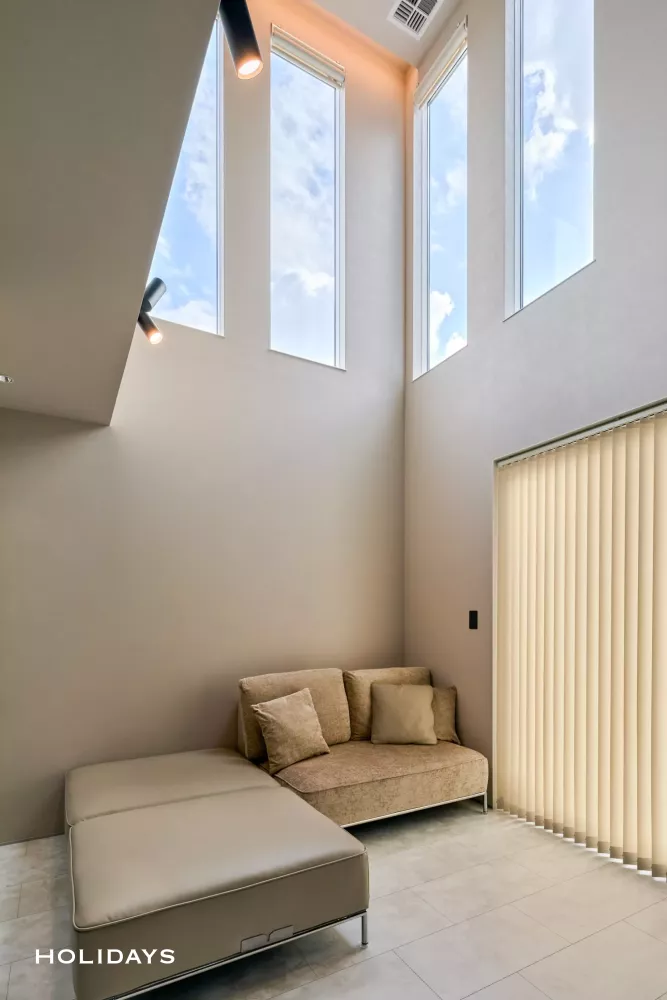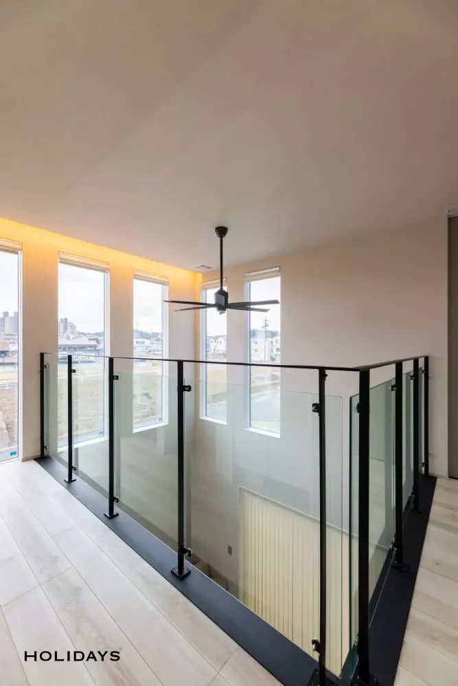 吹き抜けには大きなFIX窓が連なり、広がりのある空を眺めることができる。