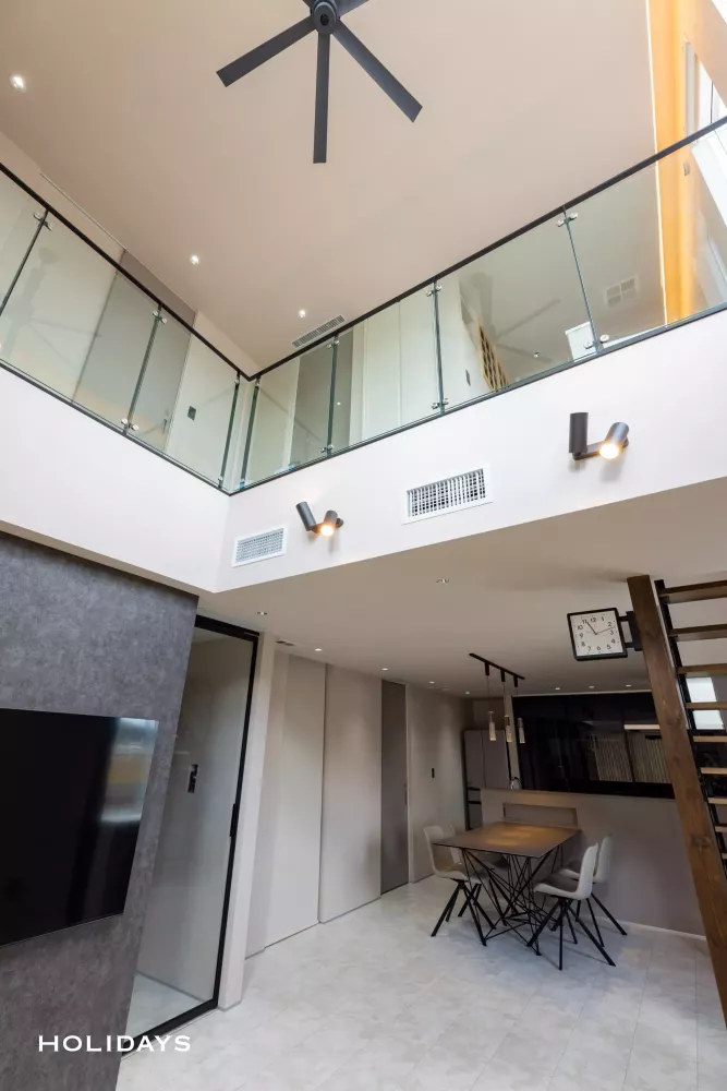 敷地の特性を生かした開放感のある空間と、生活感を感じさせない工夫により、非日常を感じるホテルライクなお家が完成しました。一階の床材はタイル調とし、スケルトン階段やアクリルパネル、ガラス扉を採用することで、広がりのある空間を演出します。
