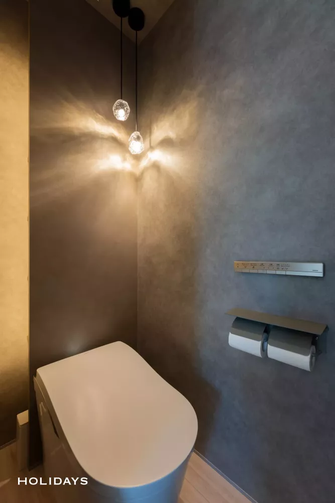 ダークグレーのアクセントクロスを基調とし、光の文様が綺麗に浮かび上がる幻想的な空間に仕上げた。