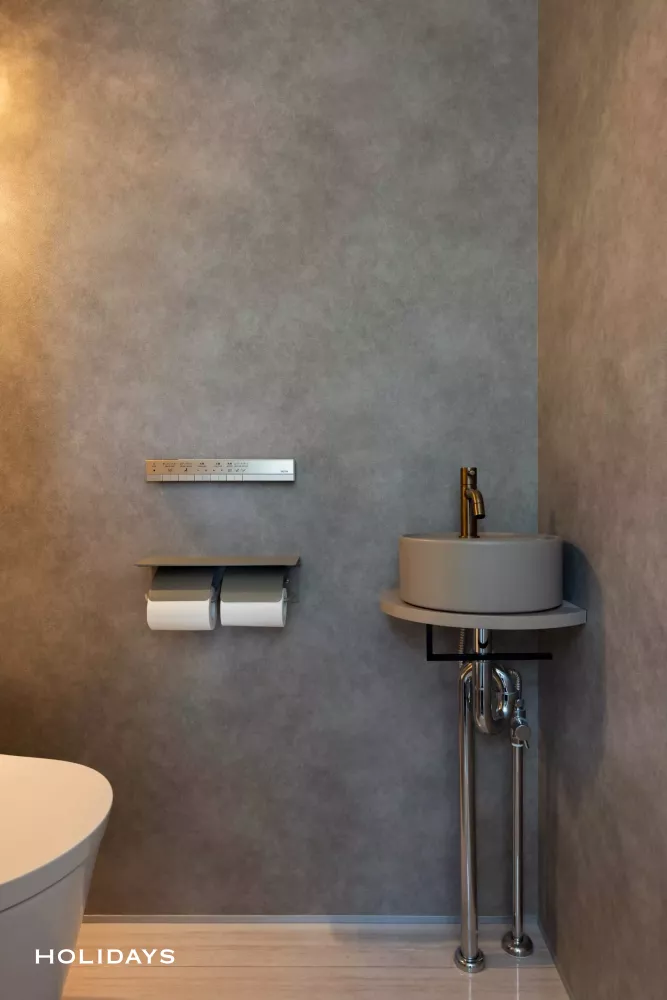 手洗いはオーナー様が一目惚れした丸い洗面ボウルを納めるため造作に。角に納めることで機能性とデザインを兼ね備えた。