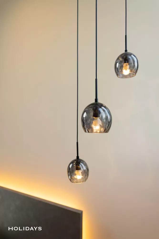 階段1段目上部には、波紋のような模様が浮かび上がるペンダントライトを設えた。空間の中でもっとも視線が抜ける位置に配置することで、昼は軽やかなアクセントとして、夜は灯りが壁面に美しく反射し、上品なきらめきで空間を彩る。