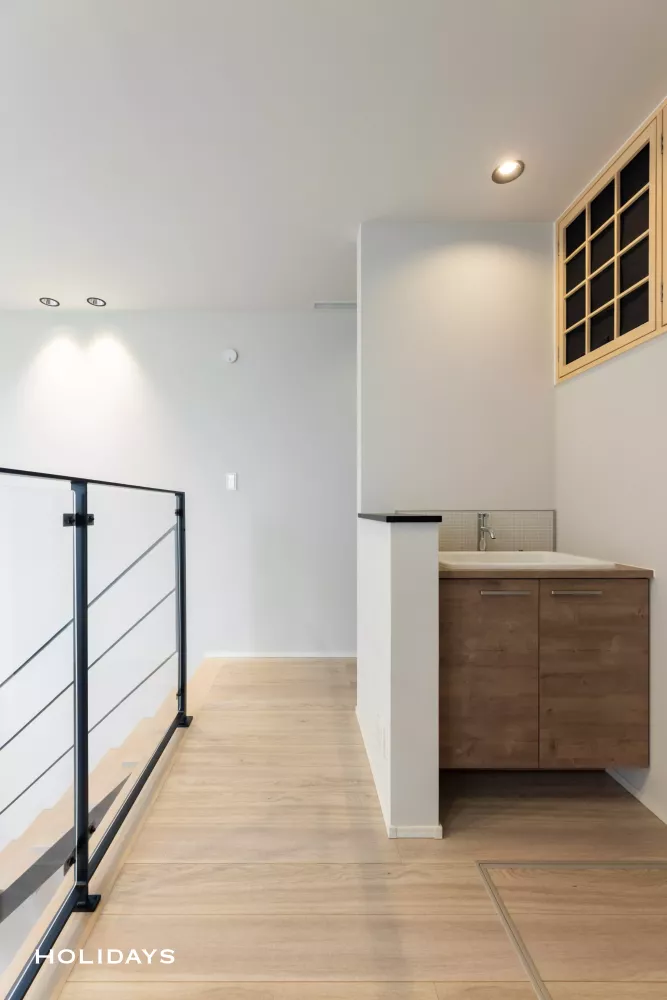 2階ホールには洗面化粧台を設置し、身支度やちょっとした手洗いができる便利な動線に。ホールの腰壁にはアイアンとクリアパネルを採用し、リビングとのつながりを感じられる開放的な空間に仕上げた。