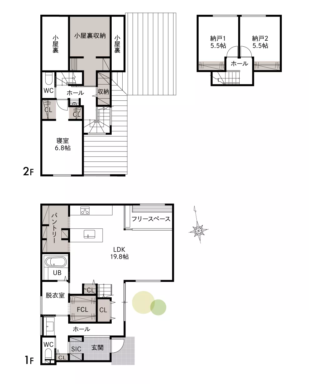 玄関収納はフロートタイプにすることで圧迫感のないスタイリッシュな印象に仕上げた。優しい色合いの木目柄を選択した事で、外観との統一感も生まれている。また、シューズインクロークも併設する事で、ベビーカーやアウトドア用品、子どもの外遊びグッズなど、玄関周りのものをまとめて収納することができる。