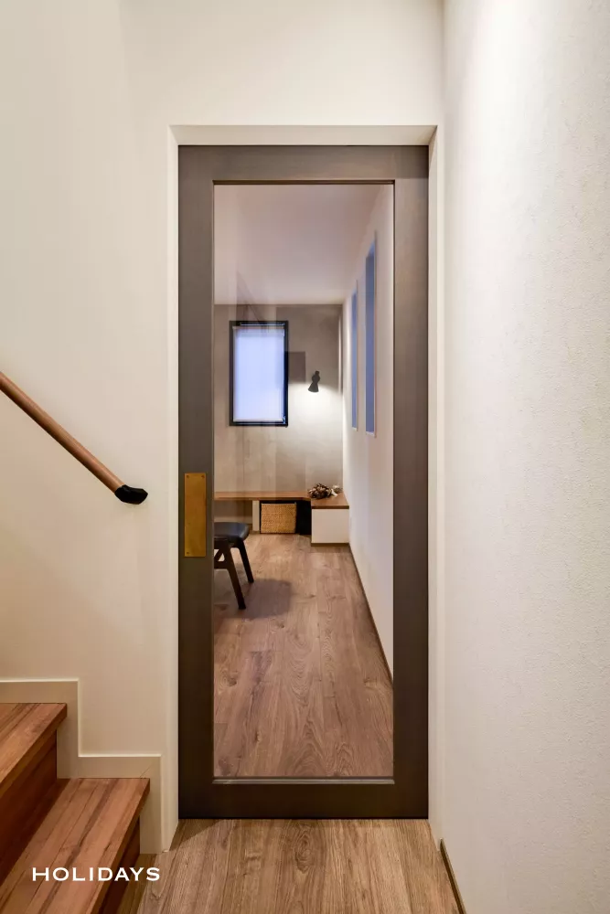 造作の開き扉はガラス扉に。LDKが見えることで奥行感が生まれ、閉塞的になりがちなホールに広がりを持たせる。グレーに水色を混ぜた木枠や真鍮の押し板が北欧のインテリアを彷彿させる。