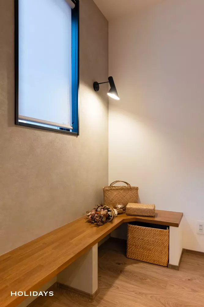 ホールから開き扉を通して見えるベンチは読書スペースへ。ブラケットライトが読書に最適な灯で照らす。