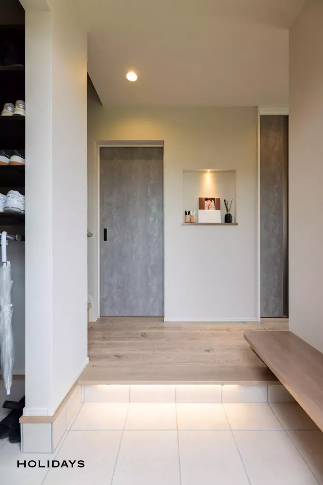 玄関正面には印象的な飾りコーナーのニッチを造作。あえてダウンライトをつけることで、落ち着いた空間にニッチコーナーが映える照明計画とした。また、靴の履き替えがしやすく、荷物なども一時的に置けるようなベンチも造作した。