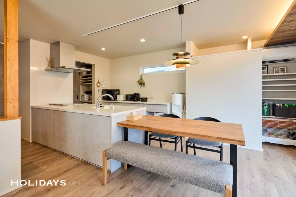 キッチンは対面型を採用しLDKの空間に一体感が出るように計画。ペットコーナーと細かい収納をまとめるスペースには、間仕切り壁を設け視線をしっかり遮っている。