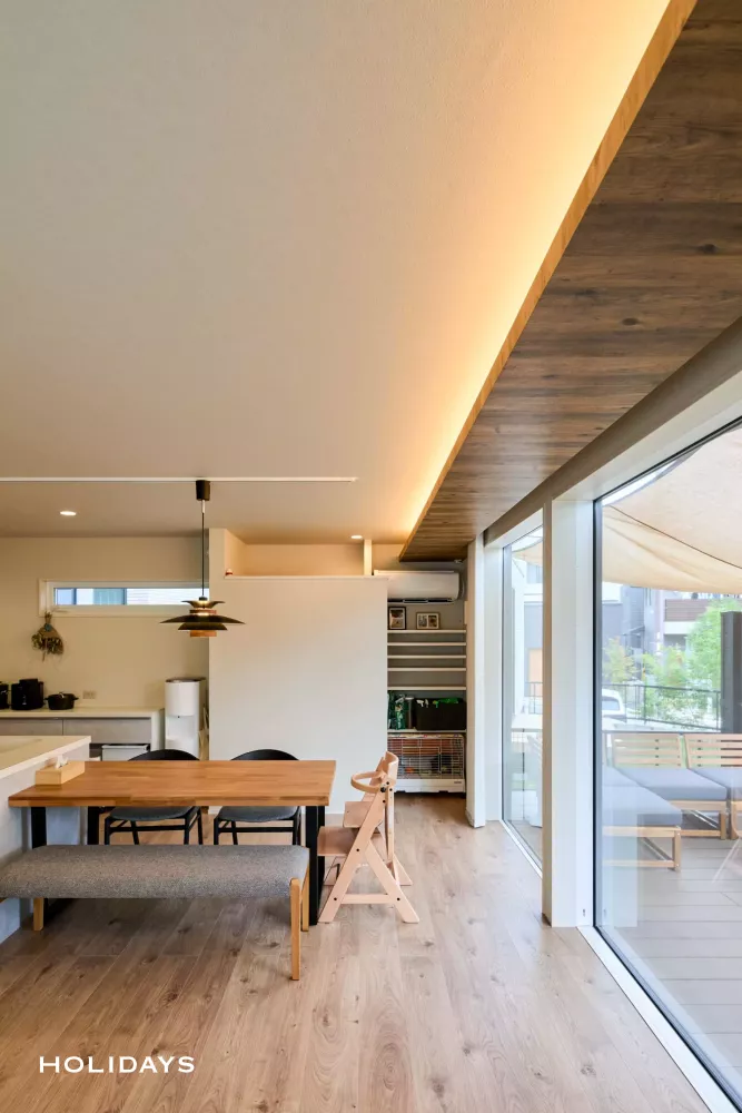 LDKの大開口窓からはそのままウッドデッキへ出入りが可能。引き込み部を全面ガラス開口のFIX窓にする事で、光が入る面積も大きくなり開放感をもたらす。