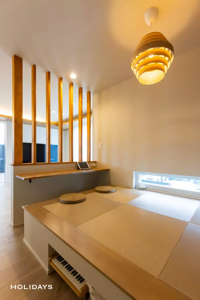 格子で目線を遮りつつタタミコーナーをLDKの一角に採用。足元にはお子様のおもちゃなどを収納できるスペースも設けている。